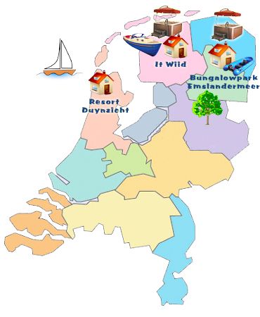 Onze bungalows en chalets liggen op de mooiste plekjes in Nederland. Verspreid over het hele land, dus voor ieder wat wils. Gelegen waar nog rust, ruimte en schone lucht is. Bij het strand, in het bos, bij golfbanen, aan een plas. Volop gelegenheid om van het buitenleven te genieten, te wandelen, te fietsen, het water op te gaan. Altijd in de buurt van mooie kleine steden, die de moeite waard zijn te bezoeken.